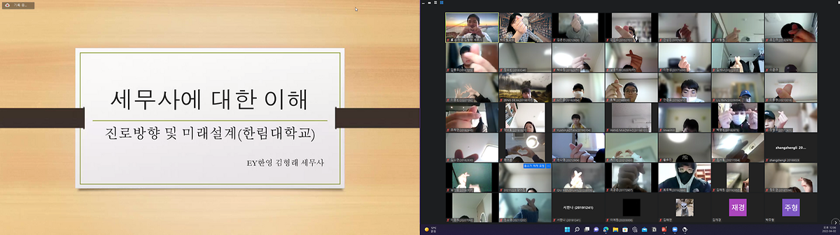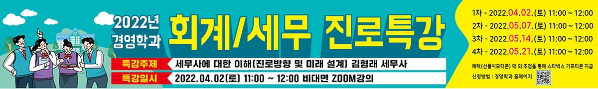본 특강에서는 진로방향 및 미래설계에 대해 학생들이 생각하고 논의해볼 수 있는 시간으로, EY한영회계법인의 김형래세무사가 ‘세무사에 대한 이해’의 내용을 강의하였습니다.