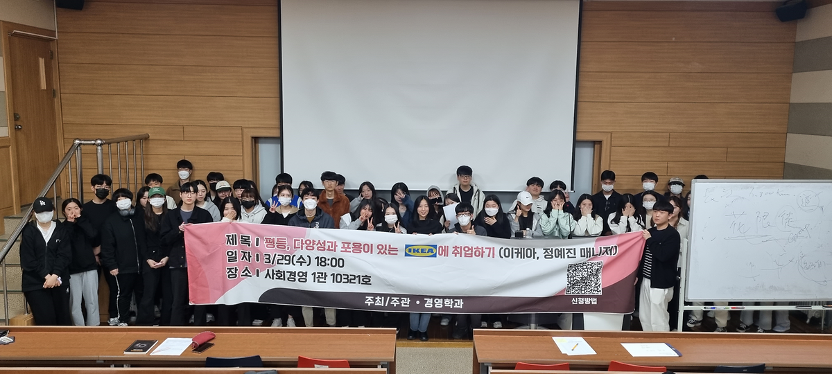정예진 매니저는 이케아의 근무환경, 분위기 등을 바탕으로 학생들의 취업 전략에 대해 상세히 강의를 해주었고, 약 80명이 넘는 학생들이 참가하여 많은 질문과 관심을 가져주어 유익한 특강 시간이 되었습니다.