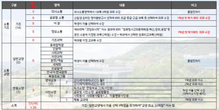 사고와표현”, “[삶의질문]삶의 큰 질문○○”, “프로젝트 중심 융합글쓰기”, “이공계를 위한 논리적사고와 글쓰기” 중 1과목,3학점을 필수로 이수하셔야합니다.