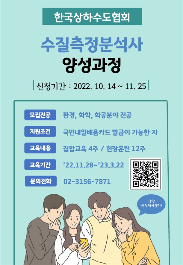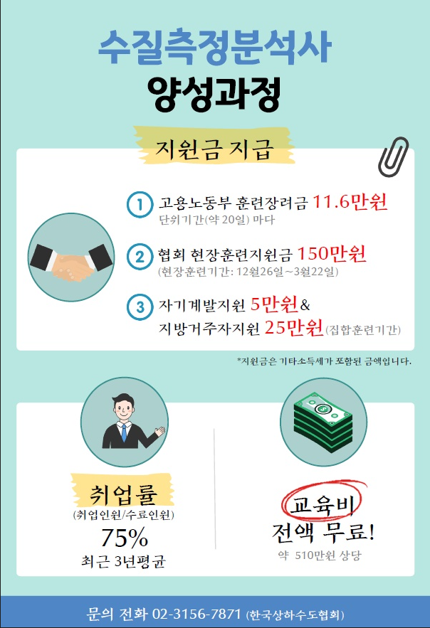 고용부 국가기간전략산업직종훈련인 '수질측정분석사 양성과정(3차)'을 모집합니다.