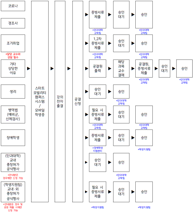 | 교내 공식행사 | (단과대학 및 학과 행사)총장이 허가한 각종 공식행사 참가 | 단과대학 교학팀 승인건으로 안내받은 공식행사일 경우 |