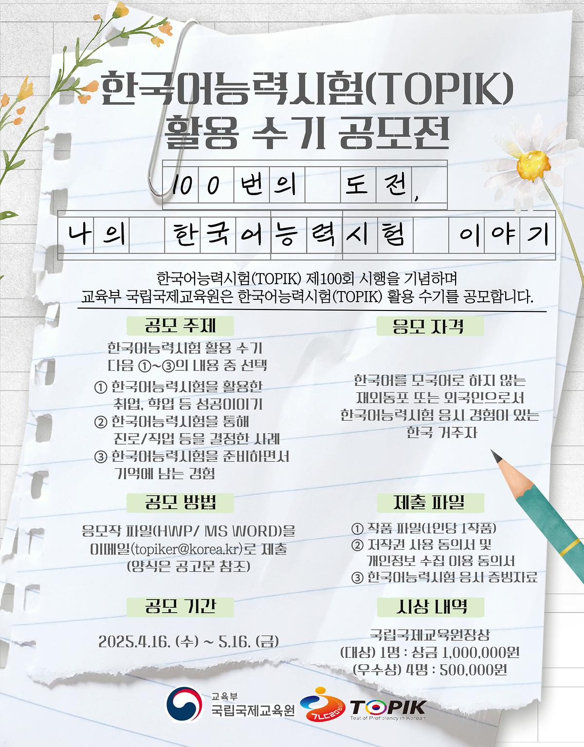 한국어능력시험 제 100회를 맞아 교육부 국립국제교육원에서 '한국어능력시험 활용 수기' 공모전을 여니 학생 여러분의 많은 참여 부탁드립니다.