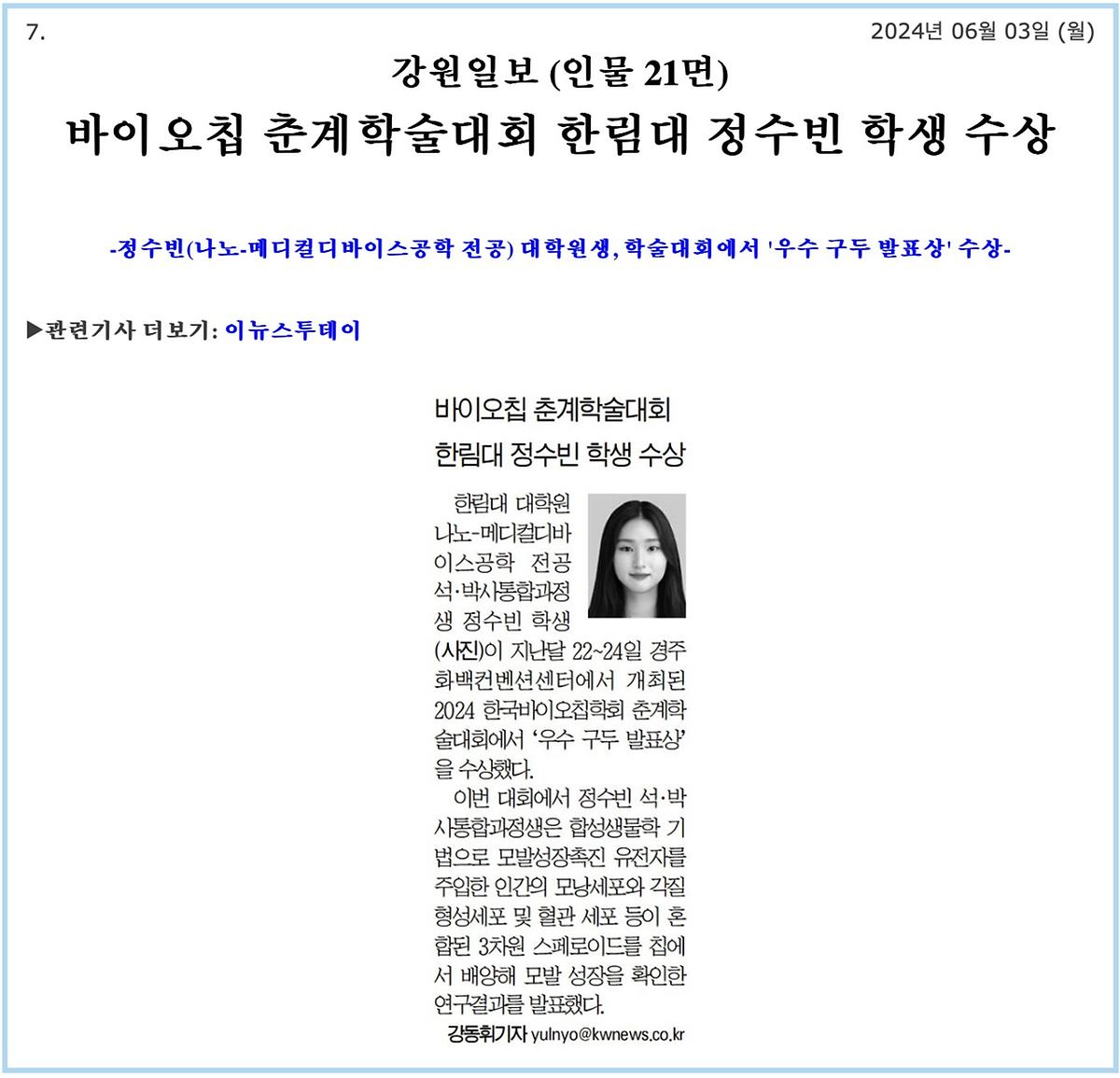 한림대학교 대학원 나노-메디컬디바이스공학 전공 석ㆍ박사통합과정생 정수빈 학생이 지난 5월 22일(수)부터 24일(금)까지 경주화백컨벤션센터(HICO)에서 개최된 2024 한국바이오칩학회 춘계학술대회에서 ”우수 구두 발표상“을 수상했다.