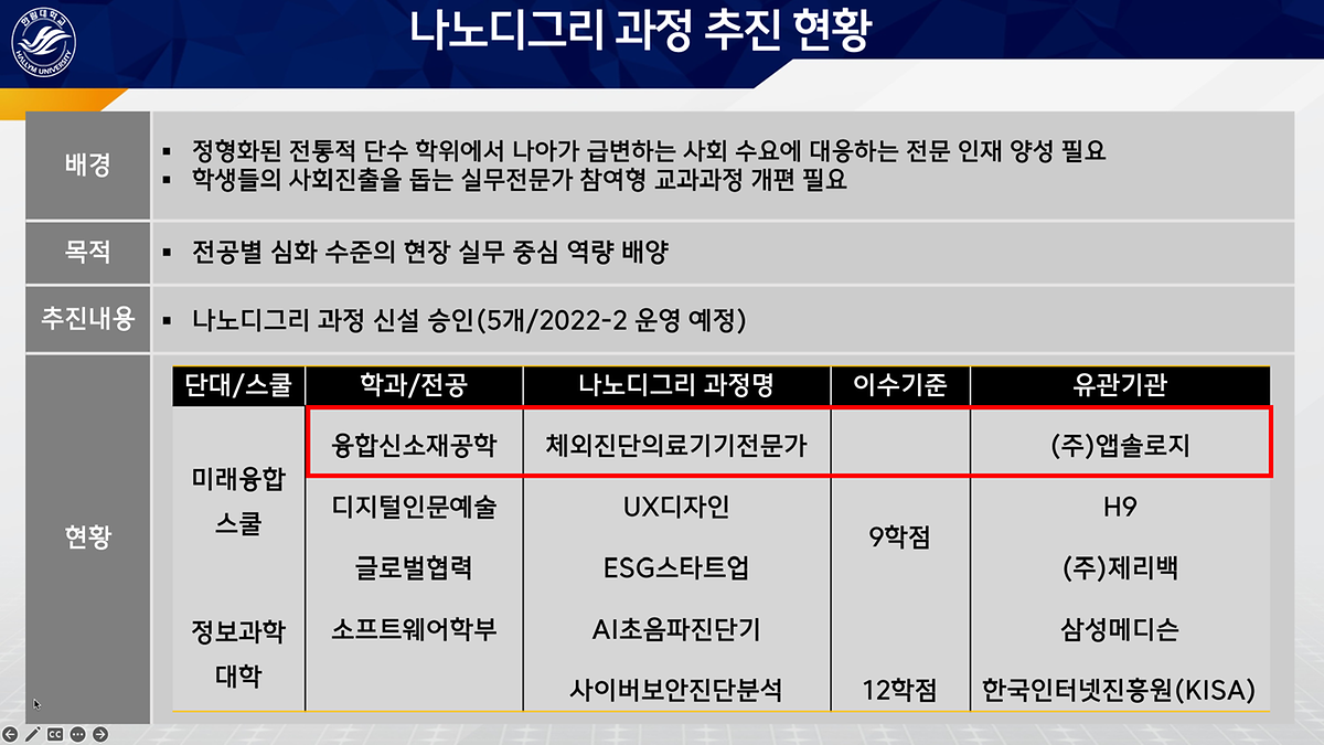 2022-2학기부터 우리 전공에서 신설되는 나노디그리 과정인 체외진단 의료기기 전문가 과정에 대한 안내 드립니다.