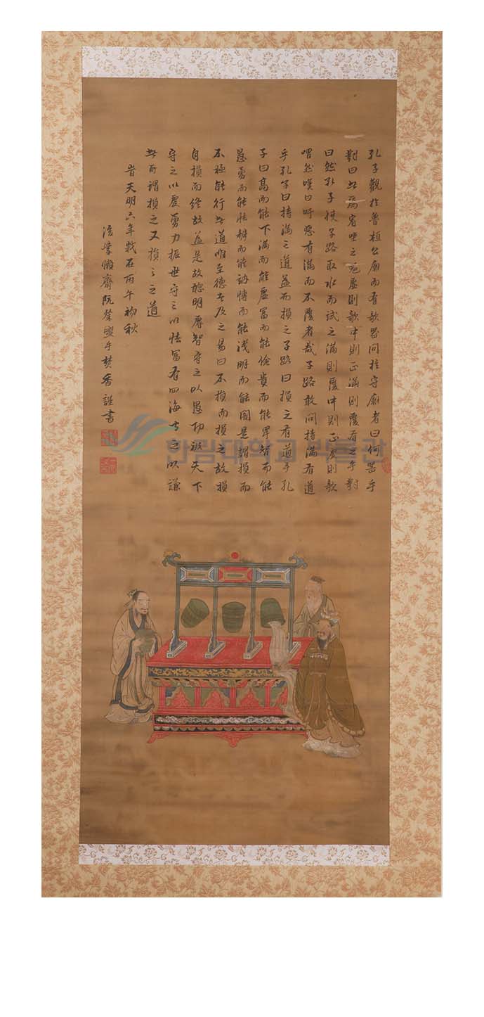 이 그림은 기기라는 독특한 그릇과 공자의 일화를 감상하고, 성현을 남다른 행적을 본받기 위한 교육용 인물화로 그려졌습니다.