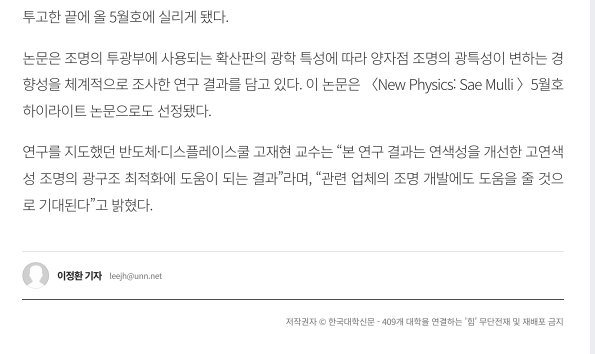 [한국대학신문]한림대 반도체·디스플레이스쿨 학부생들 국제학술지 논문 게재