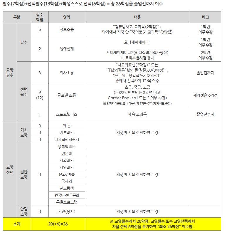 2) 2023학번 이후~: 학생이 스스로 “교양필수 또는 교양선택”에서 선택하여 6학점 이상 추가로 이수해야 졸업이 가능함.