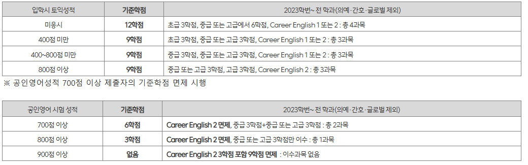 ② 2023학번 이후~ : 글로벌소통 영역에서 영어분반고사 성적에 따라 단계에 맞는 초급, 중급, 고급 표기가 된 과목으로 3과목, 반드시 3학년 이후에 듣게되는 Career English 1 또는 2 중 1과목은 포함 (9학점 이상)