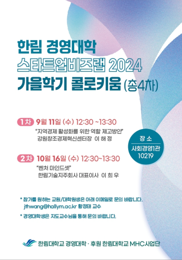 2024-2학기 경영대학 스타트업비즈랩 2024 가을학기 콜로키움(총 4차) 개최 안내