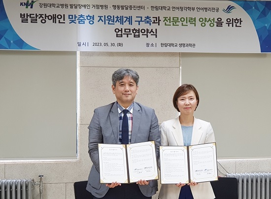 [라포르시안] 강원대학교병원 발달장애인거점병원·행동발달증진센터(센터장 황준원)는 지난 30일 한림대학교 언어청각학부 언어병리학전공과 업무협약을 체결했다고 31일 밝혔다.