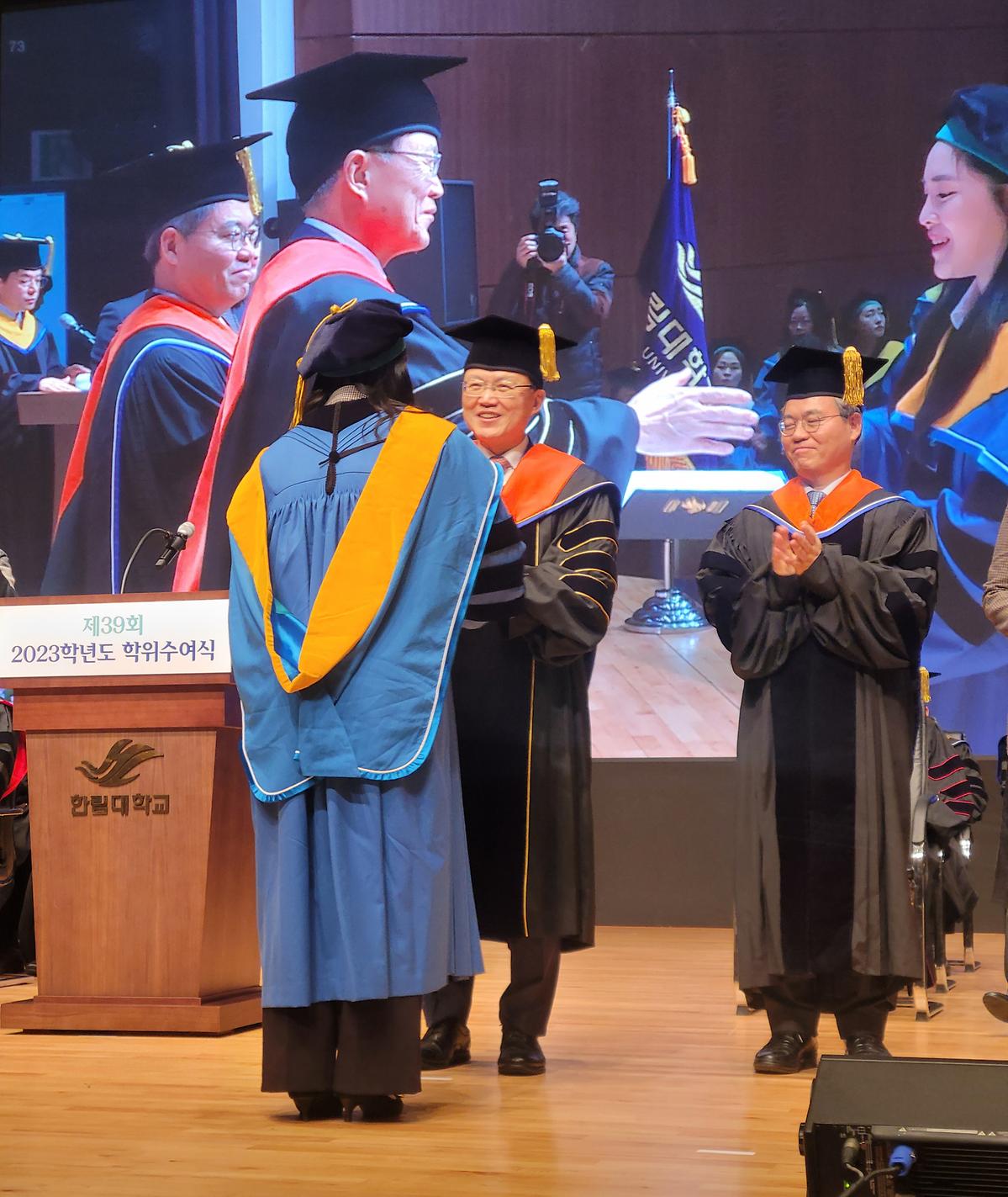 유해림 박사는 학위수여식에서 박사학위자 대표로 학위증을 수여받기도 하였습니다.