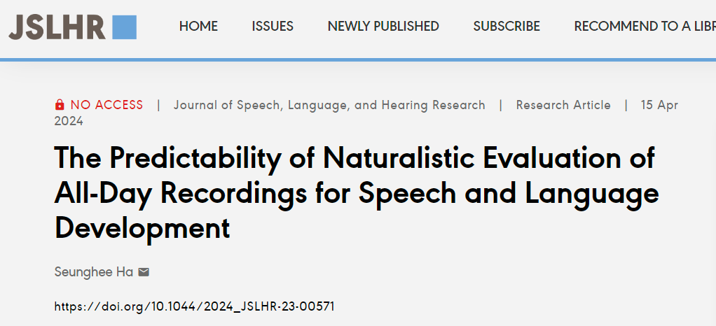 한림대는 하승희 교수의 ‘아동의 자연스런 언어 환경 평가를 통한 말-언어 발달의 예측 가능성’논문이 언어병리학 분야에서 높은 영향력을 가진 SSCI/SCI급 학술지 ‘Journal of Speech, Language, and Hearing Research’(JIF 2022=2.6, Q1) 4월 온라인판[Journal page]에 게재됐다고 18일 밝혔습니다.