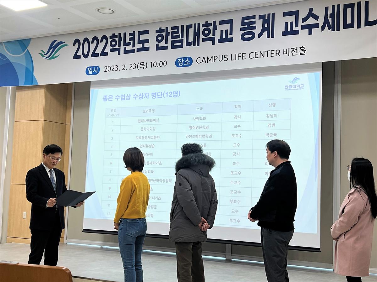 금회 공모전에서는 총 12과목이 좋은 수업상을 수상하였으며, 시상식은 지난주에 열린 2022학년도 정기 한림대학교 동계 교수세미나 중에 개최되었습니다.