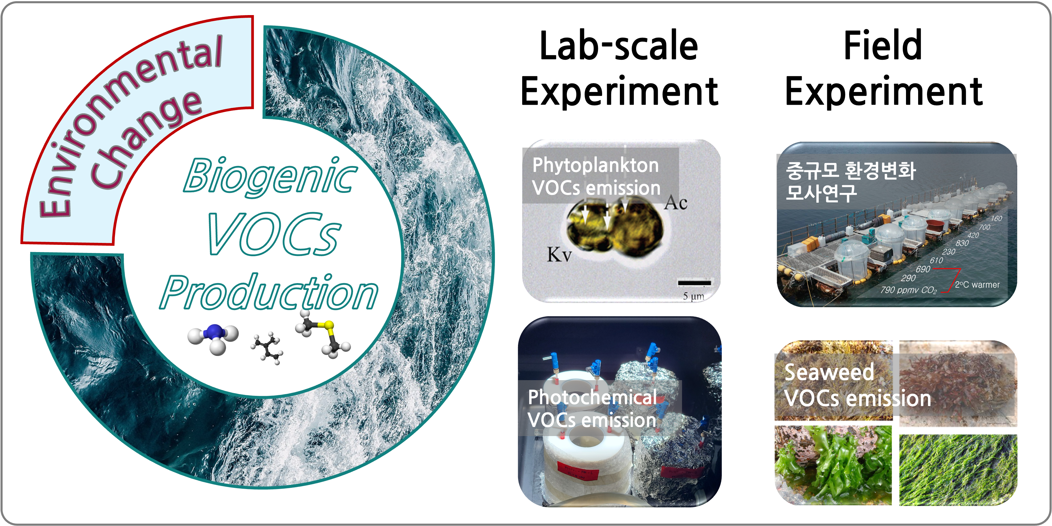대기해양관측연구실(Laboratory for Ocean-Atmosphere Studies, LOAS)은 기후변화와 해양–대기 상호작용을 이해하기 위해 국내외 다양한 관측 거점(북극, 남극, 아이슬란드, 국내 연안 등)에서 해양 기원 물질(DMS, 유기물, 온실가스 등)을 관측하고 있습니다. 현장 관측 자료를 위성자료와 통합 분석하여, 기후환경변화가 자연 유래 기후조절물질의 발생에 미치는 영향을 연구합니다. 또한, 해양 생물의 성장과 분해 과정에서 배출되는 기후가스의 특성을 파악하기 위해 실험실 규모 및 중규모 환경모사 실험을 수행하고 있습니다.