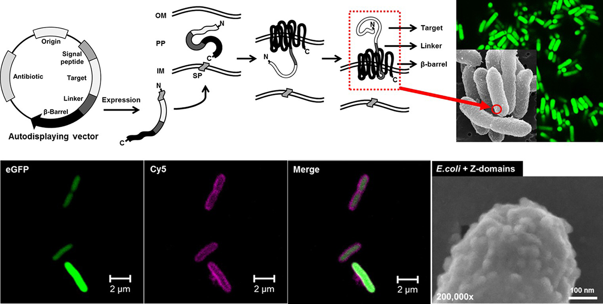 - MIN Lab.에서는 표면발현 기술을 응용하여 다양한 단백질 및 효소를 발현하고 이를 진단검사와 바이오센서에 응용하는 연구를 진행중입니다. 세포기질(cytosol)에 단백질을 발현하는 보통의 단백질 발현기술과 달리, 표면발현기술은 단백질을 세포의 외막에 고정화한 형태로 발현합니다. 본 연구실에서 사용하는 표면발현기술은 그람음성균의 외막에 자연적으로 존재하는 외막단백질을 이용하여 원하는 타겟을 고밀도로, 그리고 100 % 같은 배향을 가진 상태로 발현하는 특징을 가집니다. 또한 표면발현기술은 그람음성균을 활용하는 단백질발현 방법으로, 세포분열 주기가 짧고 배양이 간단하기에 단백질 발현 효율이 좋은 장점을 가지고 있어 생명공학 분야에서 가장 널리 사용되는 대장균을 활용 가능합니다.