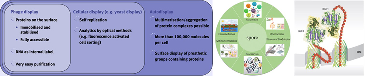 - 표면발현을 통하여 발현된 단백질은 별도의 복잡한 크로마토그래피 과정 없이 단순한 원심분리만으로도 정제가 가능하며, 발현 단백질에 세포막 환경이 조성된다는 장점이 있습니다. 또한 발현된 단백질은 세포막에 고정되어 있지 않고, 인지질 이중막을 따라서 이동이 가능합니다. 이러한 특징으로 인하여 이량체나 삼량체 이상의 구조를 갖는 단백질의 발현이 가능한 장점을 가집니다. 이러한 표면발현 기술은 세포막 기반의 효소의 발현, 약물 스크리닝 및 활성도 테스트, 약물 대사, enzyme refolding, whole cell biocatalyst, translocation 등의 연구에 활용되어 왔습니다.