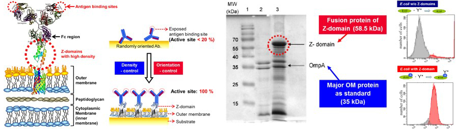 - MIN Lab.에서는 고감도의 진단검사 기술에 관련한 연구도 수행하고 있습니다. 이를 위해서 앞서 말씀드린 표면발현 기술을 면역검사에 적용하고 있습니다. 면역검사는 가장 널리 사용되고 있는 진단검사의 일종으로 항원-항체 반응을 활용하여 원하고자 하는 항원 또는 항체를 정량검사하는 방법입니다. 분자인식을 위해 가장 널리 사용되고 있는 항체는 Y자 형태의 단백질로, 2개의 항원과의 결합부위가 양쪽 가지 끝에 국소적으로 존재하고 있습니다. 이러한 구조적인 특징으로 인하여 고밀도의 항체고정화 기술이나, 항체의 배향조절 기술을 필요로 하고 있습니다. MIN Lab.에서는 배향조절을 위해 항체의 Fc부분과 결합특이성을 가지는 Z-domain을 표면발현의 타겟 단백질로 활용하여 대장균 외막에 발현하였습니다. 이러한 Z-domain은 오토디스플레이를 대장균 외막에 1.8∙105 copies/cell로 고밀도로 발현되어 있어 배향조절효과와 함께 밀도조절 효과까지 가지고 있습니다. 이 외에도 바이오틴과의 결합특이성을 가지는 streptavidin을 발현하여 진단검사에 응용하고 있습니다.
