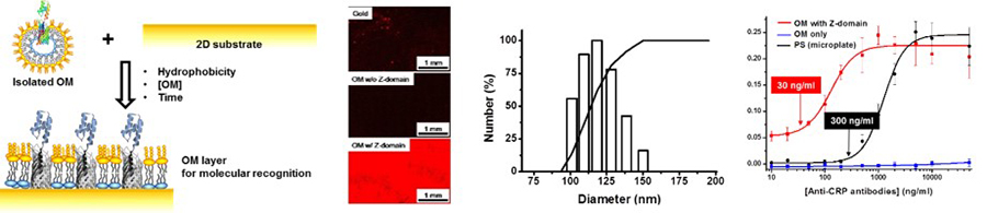 - 또한 MIN Lab.에서는 표면발현된 대장균의 외막만을 리포좀(liposome)형태로 분리하고, 이를 다시 2차원 평면에 코팅하는 기술을 보유하고 있습니다. 이를 활용하여 친화도 단백질 표면발현된 대장균의 외막을 마이크로플레이트 표면에 코팅하여 고감도의 면역검사법을 개발하였습니다. 이러한 연구 결과들은 Analytica Chimica Acta, Biochimica et Biophysica Acta-Biomembrane, Applied Surface Scinece, Enzyme & Microbial Technology, Analyst, Journal of Pharmaceutical & Biomedical Analysis, Analytical Methods, BioChip Journal 등의 저널에 그 결과들을 출판하면서 지속적인 연구를 이어가고 있습니다.