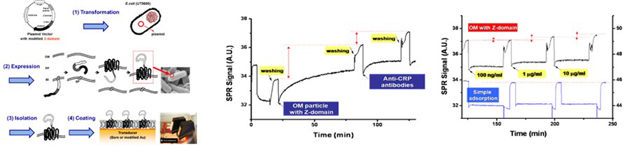- MIN Lab.에서는 친화도 단백질 표면발현 대장균 기반의 바이오센서, 효소 표면발현 대장균 기반의 전기화학 바이오센서, 유속조건에서 사용가능한 플루이딕 바이오센서 등에 관한 연구를 진행중입니다. 친화도 단백질 표면발현 대장균을 활용한 바이오센서의 경우, 앞서 말씀드린 외막 코팅기술을 이용하여 면역센서 개발에 활용하고 있습니다. 바이오센서는 보통 분자인지막을 통해 분석물을 선택적으로 인식하고 신호를 생성합니다. 바이오센서의 트랜스듀서 표면에 위치하는 분자인지막은 센서의 종류에 따라 다르지만 그 두께에 제약이 있는 경우가 있는데, 대표적 바이오센서의 하나인 SPR(surface plasmon resonance)바이오센서의 경우 evanescence field 기반의 광학센서로 약 100 nm 이내의 물질을 인식합니다. Z-domain이 표면발현된 대장균 외막을 SPR바이오센서의 표면에 적층시켜 항체를 고정할 수 있는 기능성 막을 형성하고, 항체의 고정을 통해 배향조절이 가능한 분자인지막을 구현하였습니다. 표면발현 기술이 적용된 바이오센서는 물리적 흡착을 통해 무작위로 센서 표면에 고정된 항체막과 비교하여 100배 이상 민감도가 향상되었습니다.
